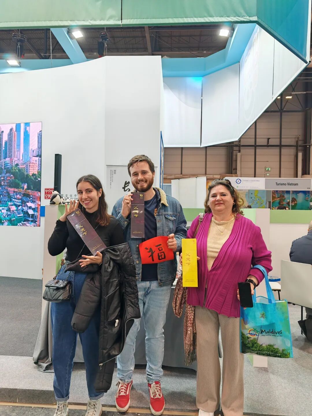 2024年1月24日,在西班牙马德里中国文化中心,几位西班牙朋友手拿着乂天下白金古藤开心的拍照留念。